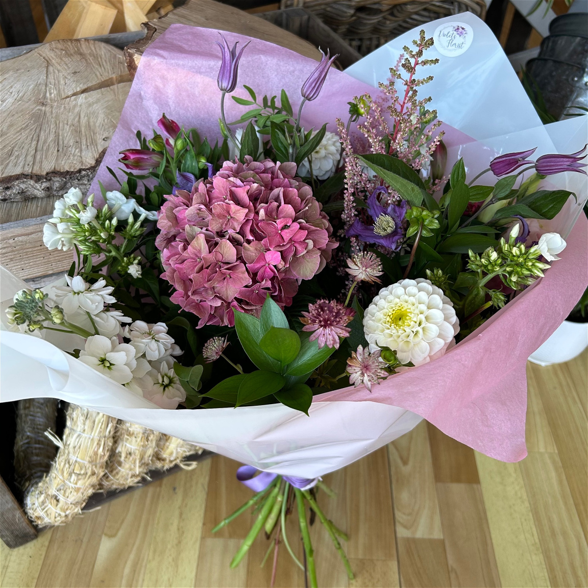 Seasonal blooms in plum, pink & purple shades chosen by our experienced florist, tied together with foliage and wrapped in frosted cello.
