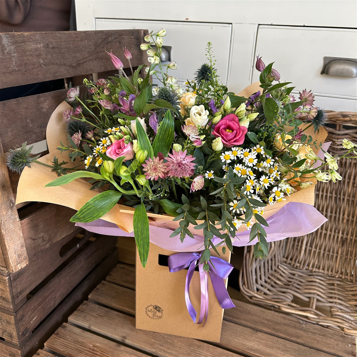 Delicate flowers that depict a wild meadow, tied together and arranged as a hand tied bouquet in water, displayed in a box and finished with a bow.
